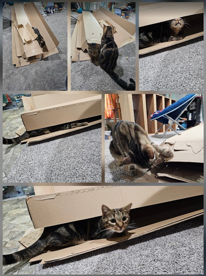 But I also started implementing a plan to use Ikea’s “Billy” bookcase units as fake “built-in” bookshelves in my house. This means… playtime with boxes for Ruby and Pearl!